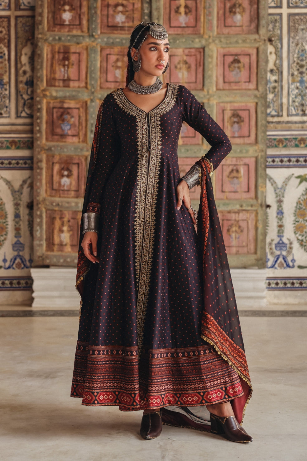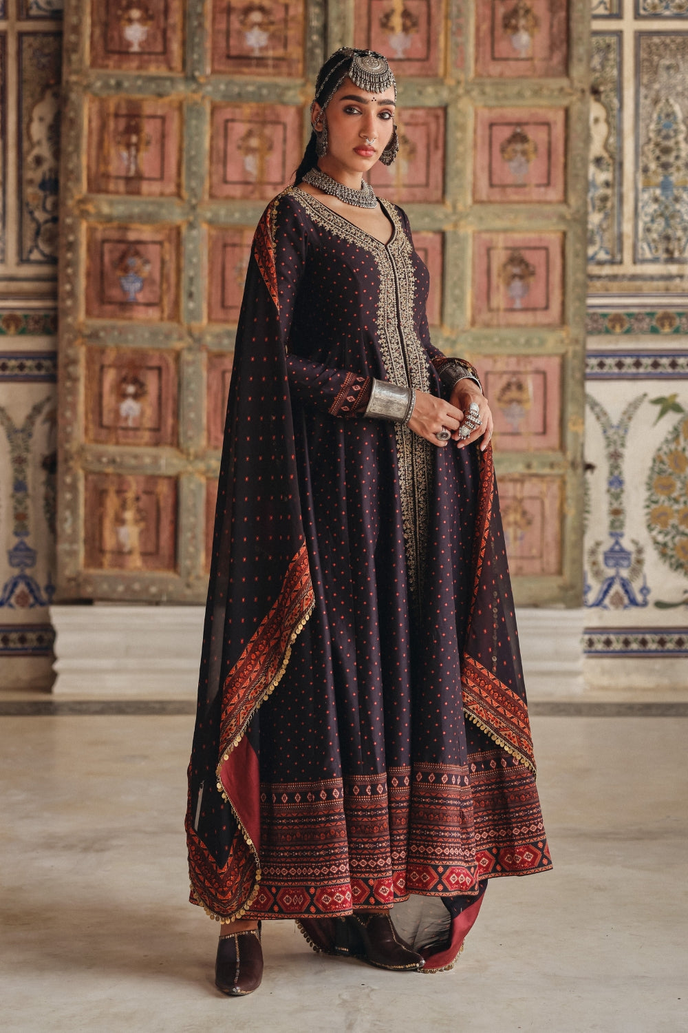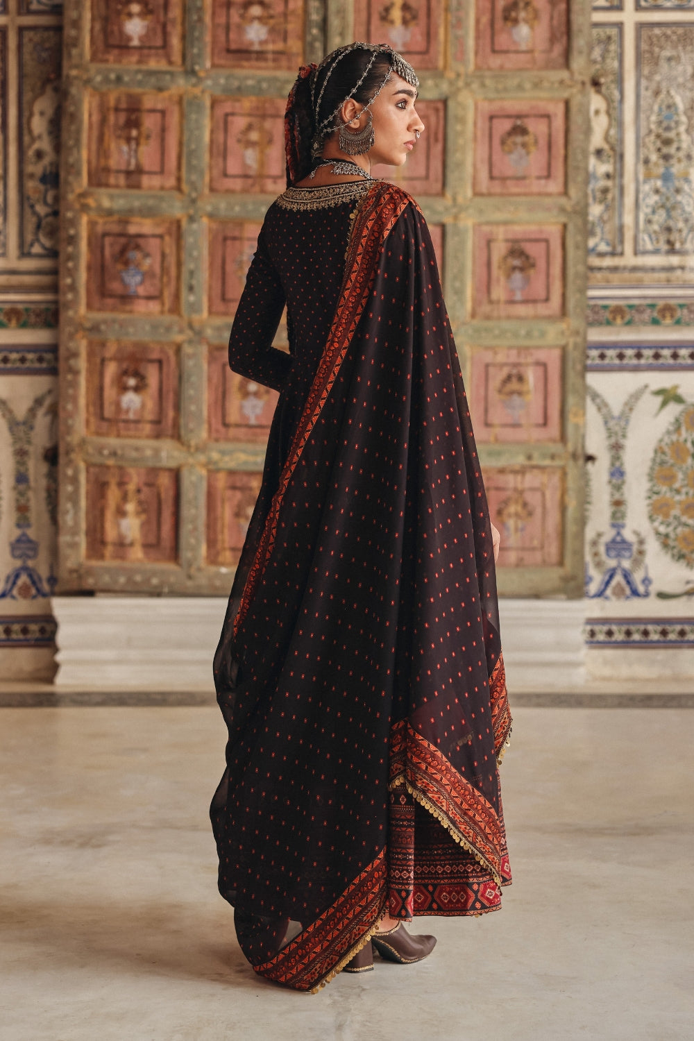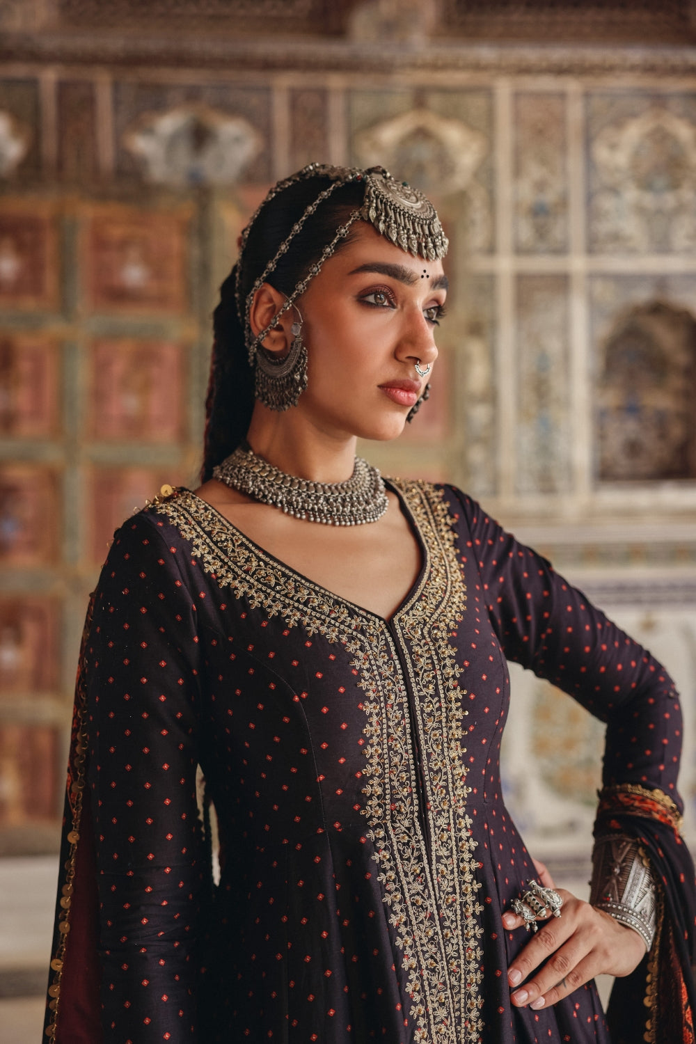 This dark brown Anarkali set features a richly embroidered deep brown fabric adorned with intricate gold motifs throughout. The garment showcases a fitted bodice with detailed embroidery around the neckline and sleeves, flowing into a full, flared skirt with heavy embroidered borders. The open back with tie-up tassels adds a unique touch, while the matching embroidered dupatta completes the look.