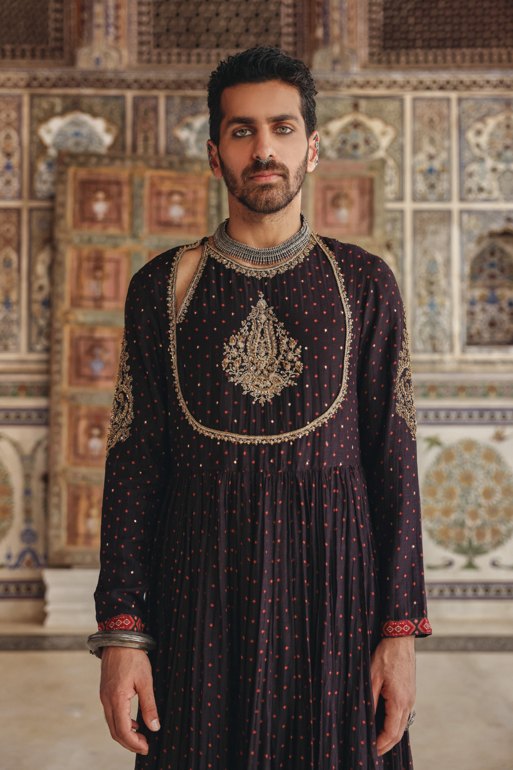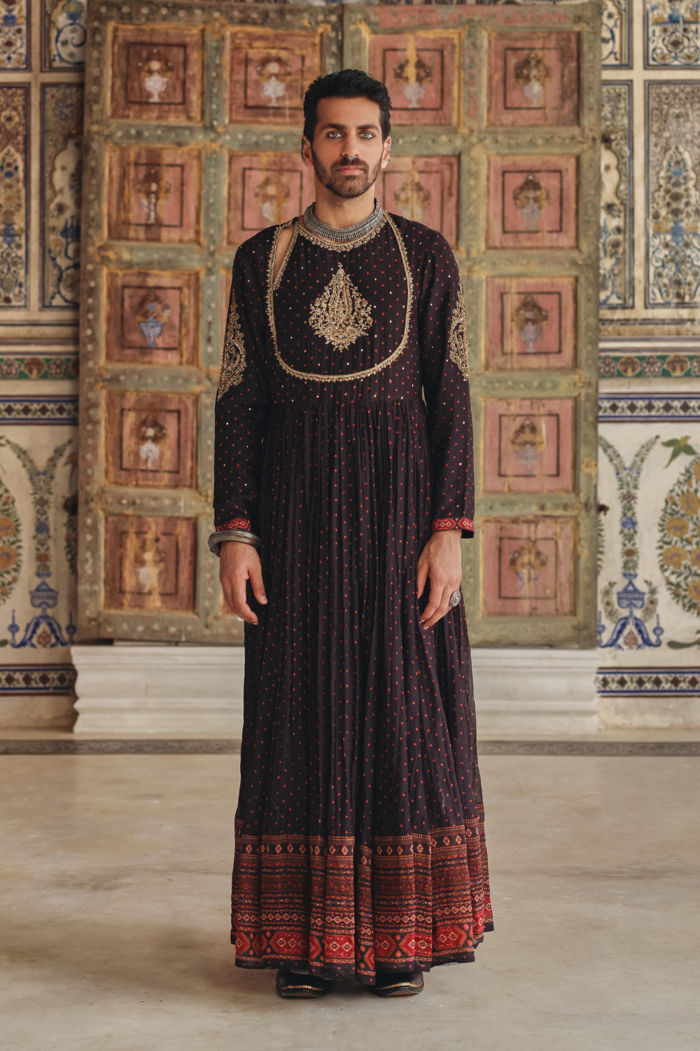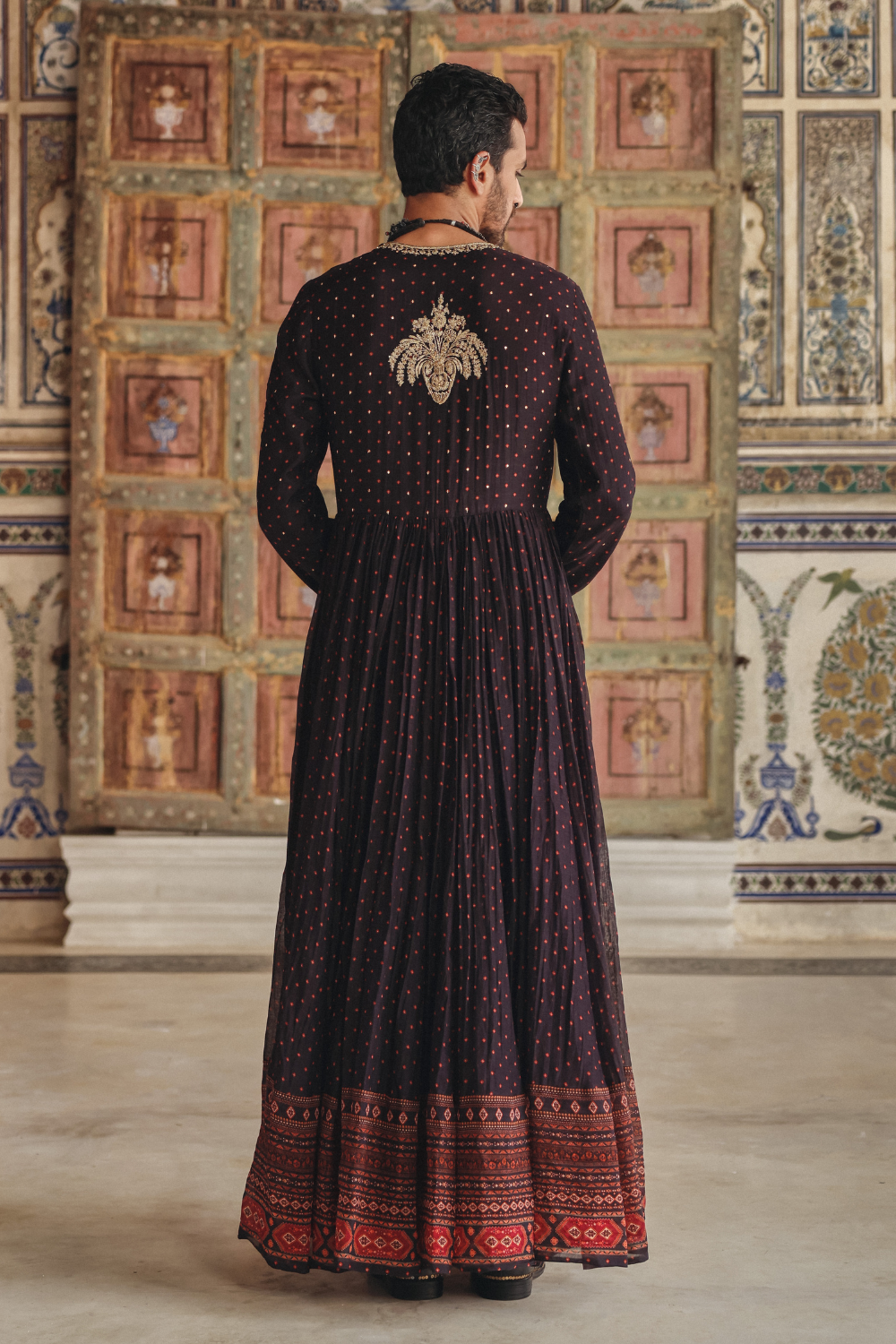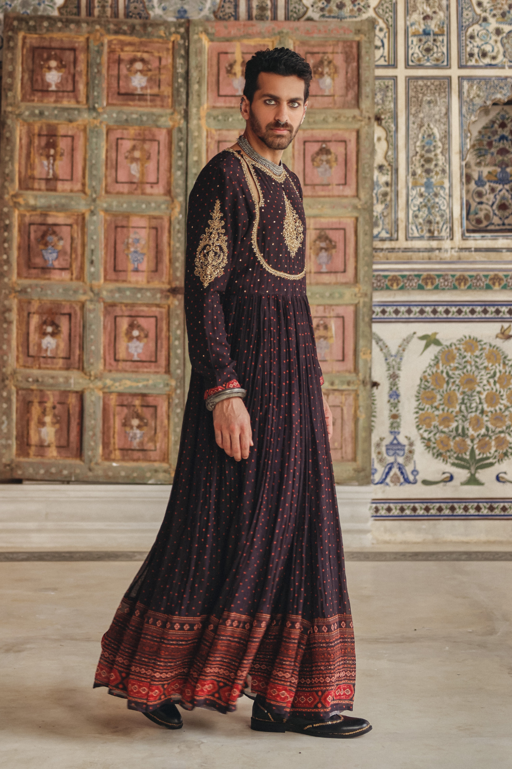 This regal angrakha-style silhouette flows with graceful volume, tailored in a rich plum base with all-over prints. Intricate gold embroidery crowns the chest and back, adding a majestic focal point to the fluid drape. Delicate gathers enhance the flare, while the signature rust-hued border at the hem lends grounded opulence With its dramatic fall and structured shoulders, the ensemble bridges heritage with high-impact elegance.