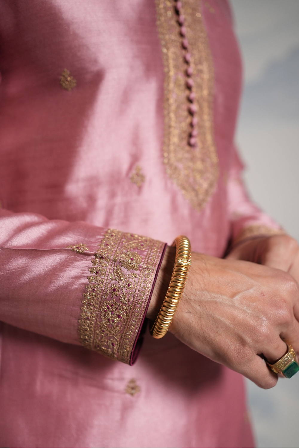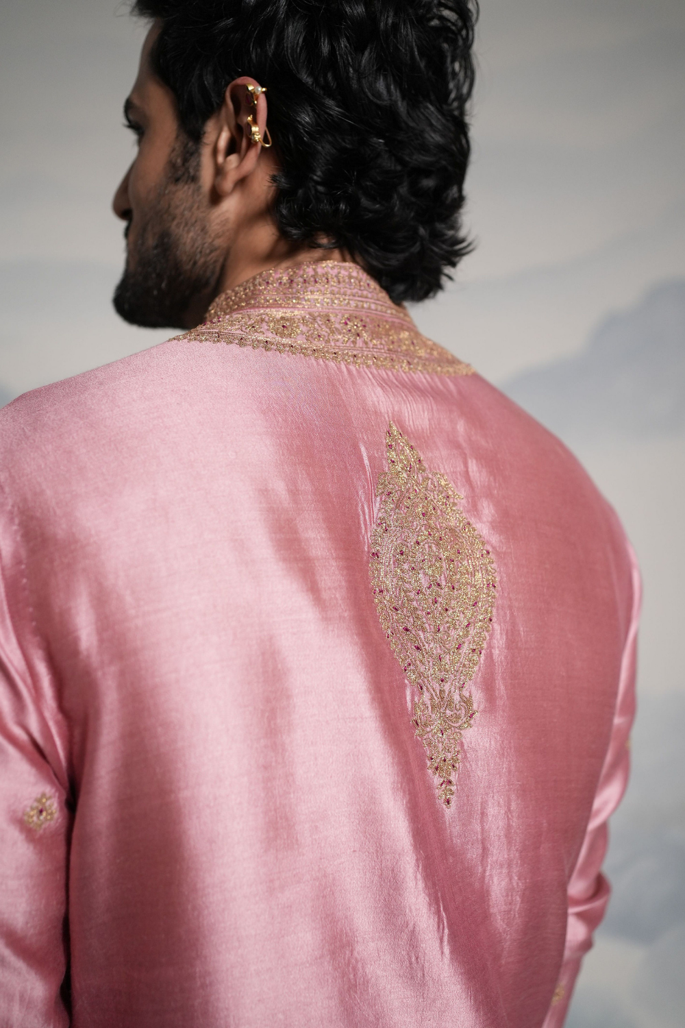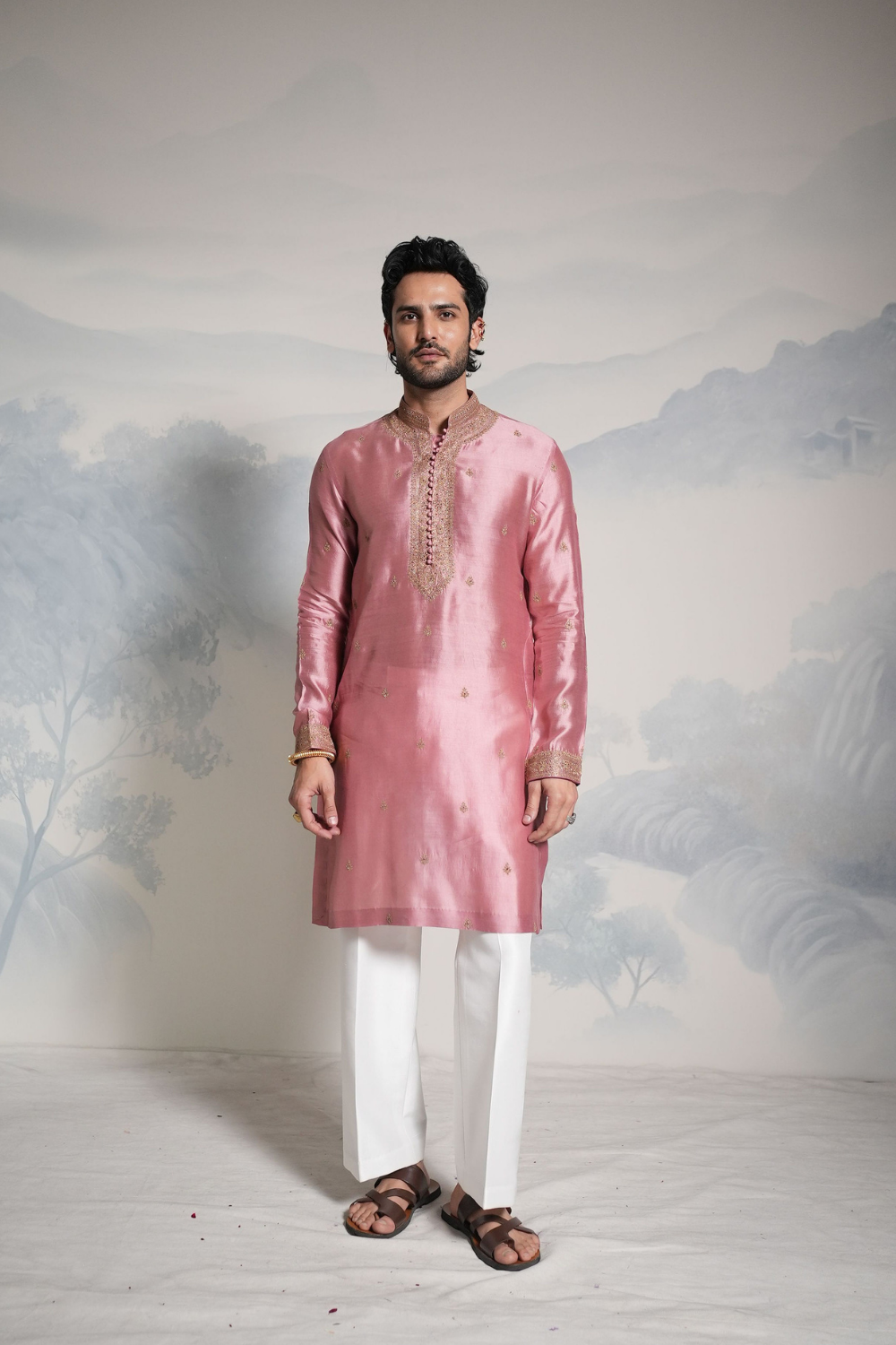 Featuring a lilac men's kurta set paired with off-white paraller pants and antique gold hand embroidery on it.