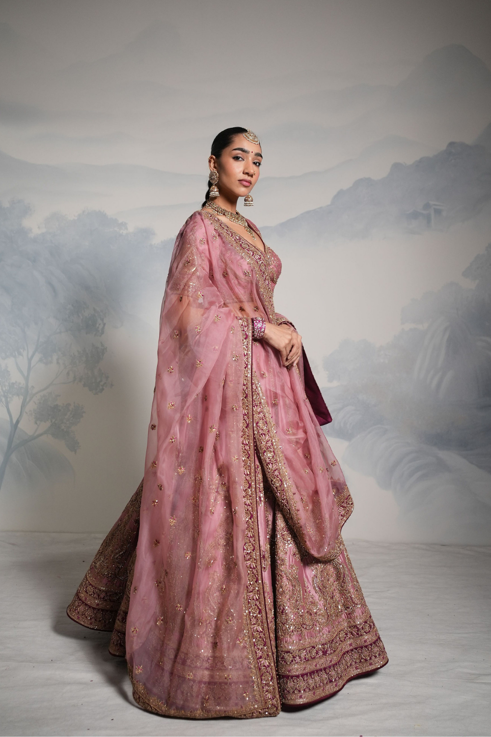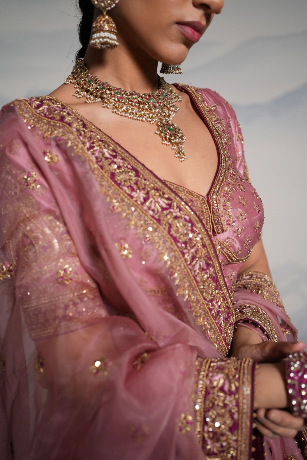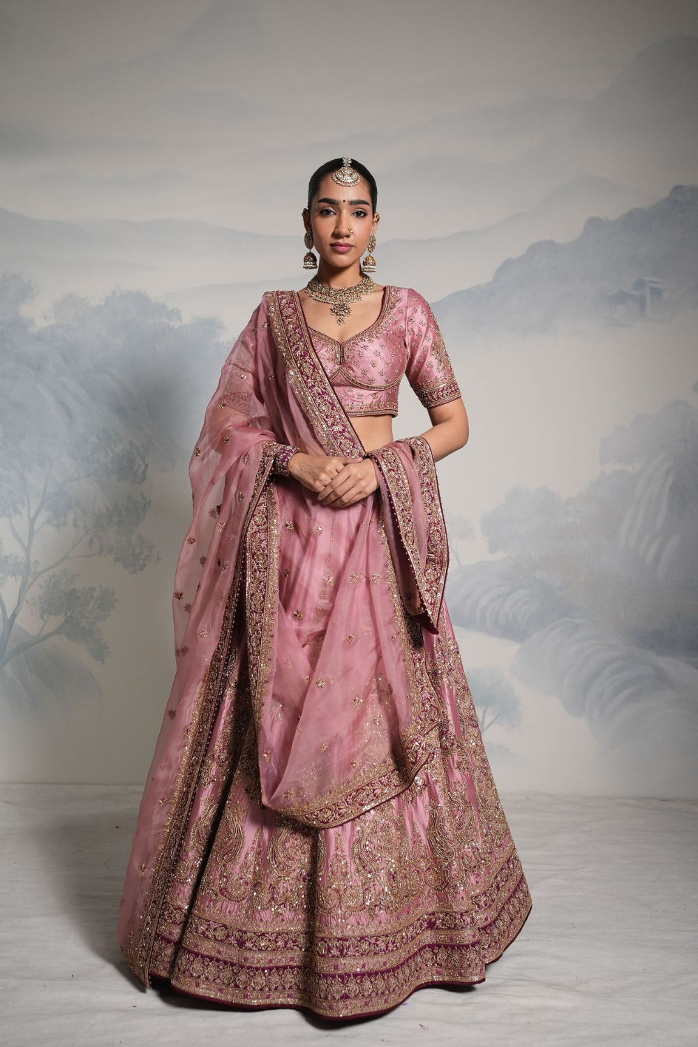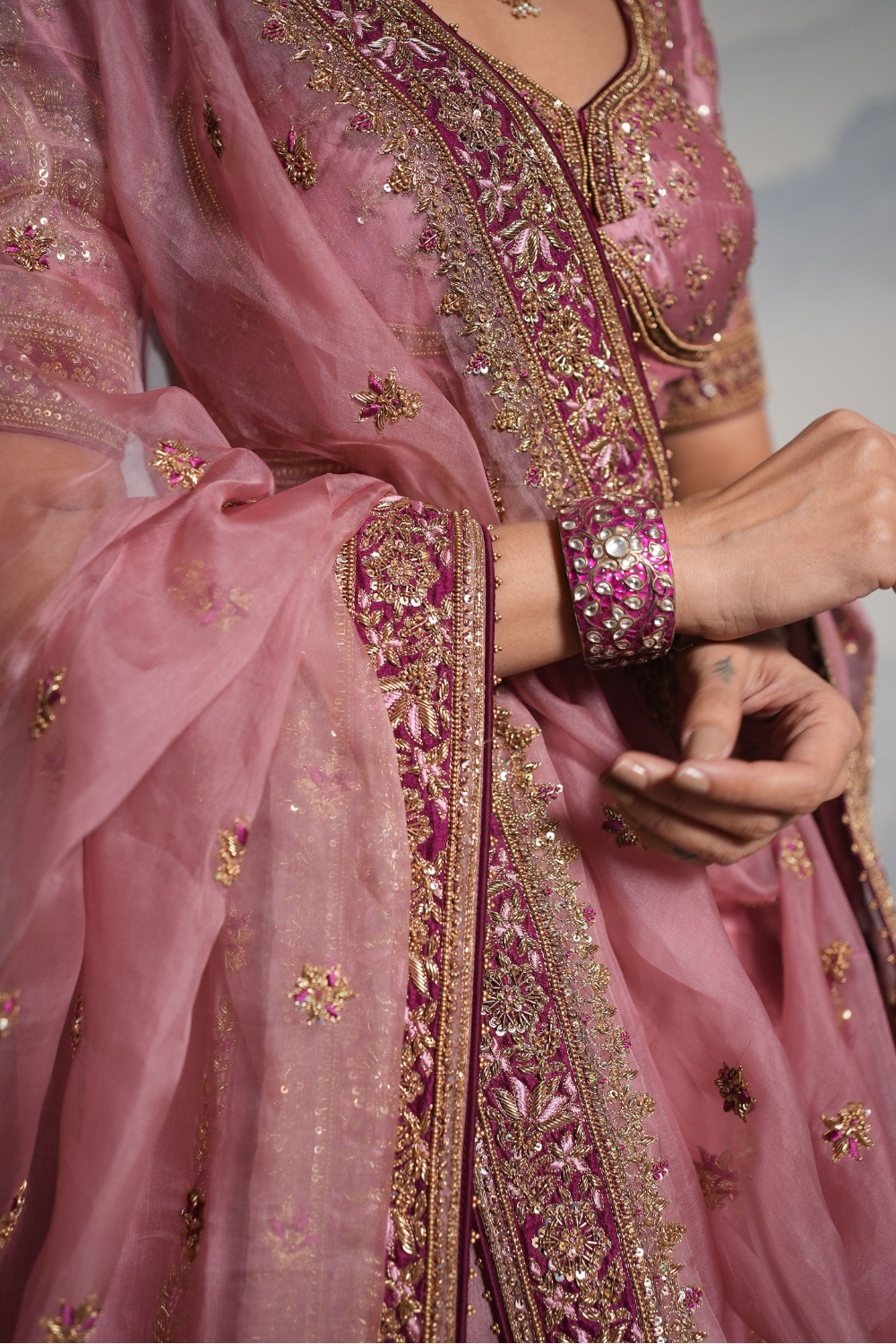 Featuring a lilac wine lehenga set paired with a organza base dupatta with gold dori, zardozi and embellished hand embroidery. Every element of this ensemble showcases meticulous handwork, making it a timeless piece rooted in craft and culture.