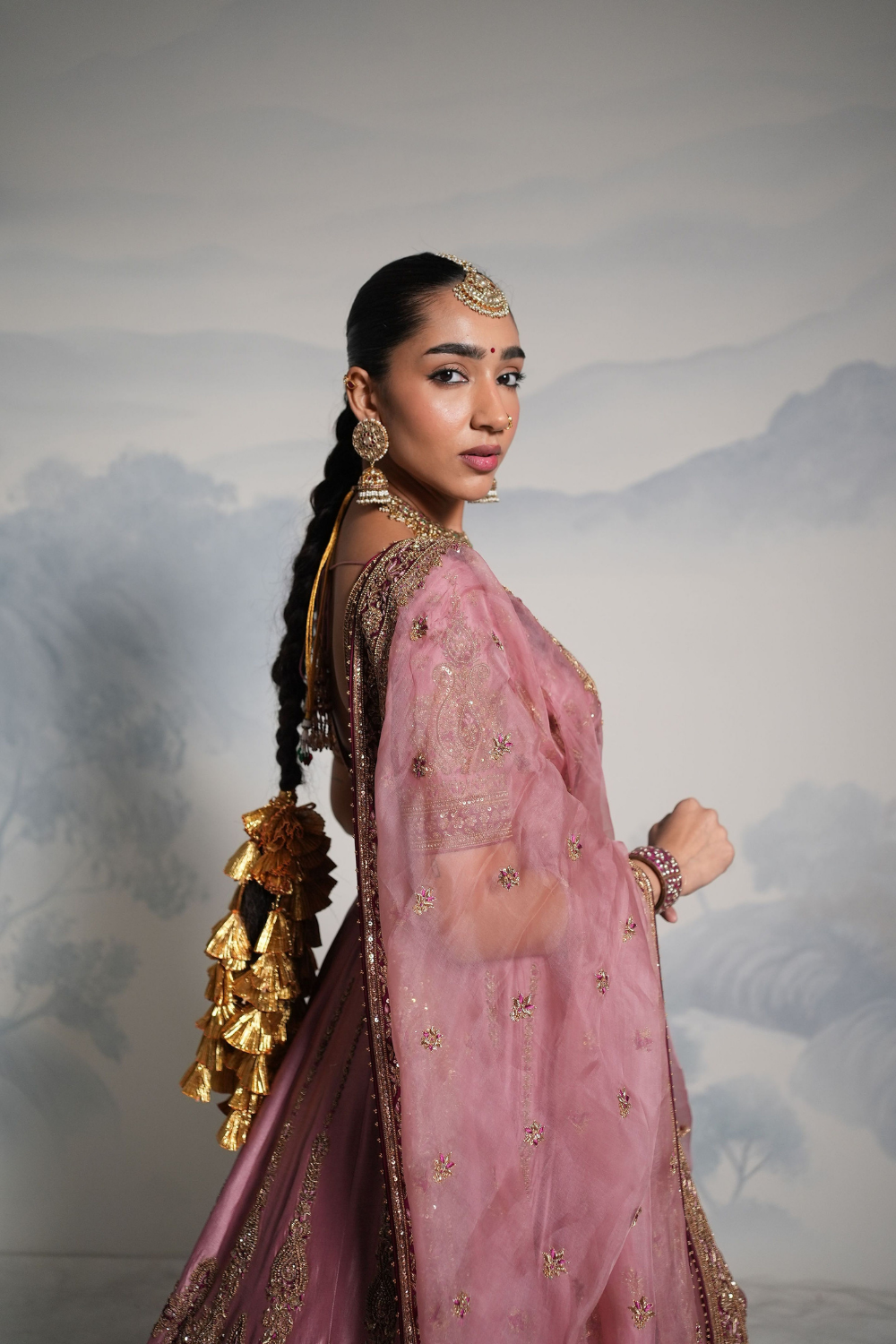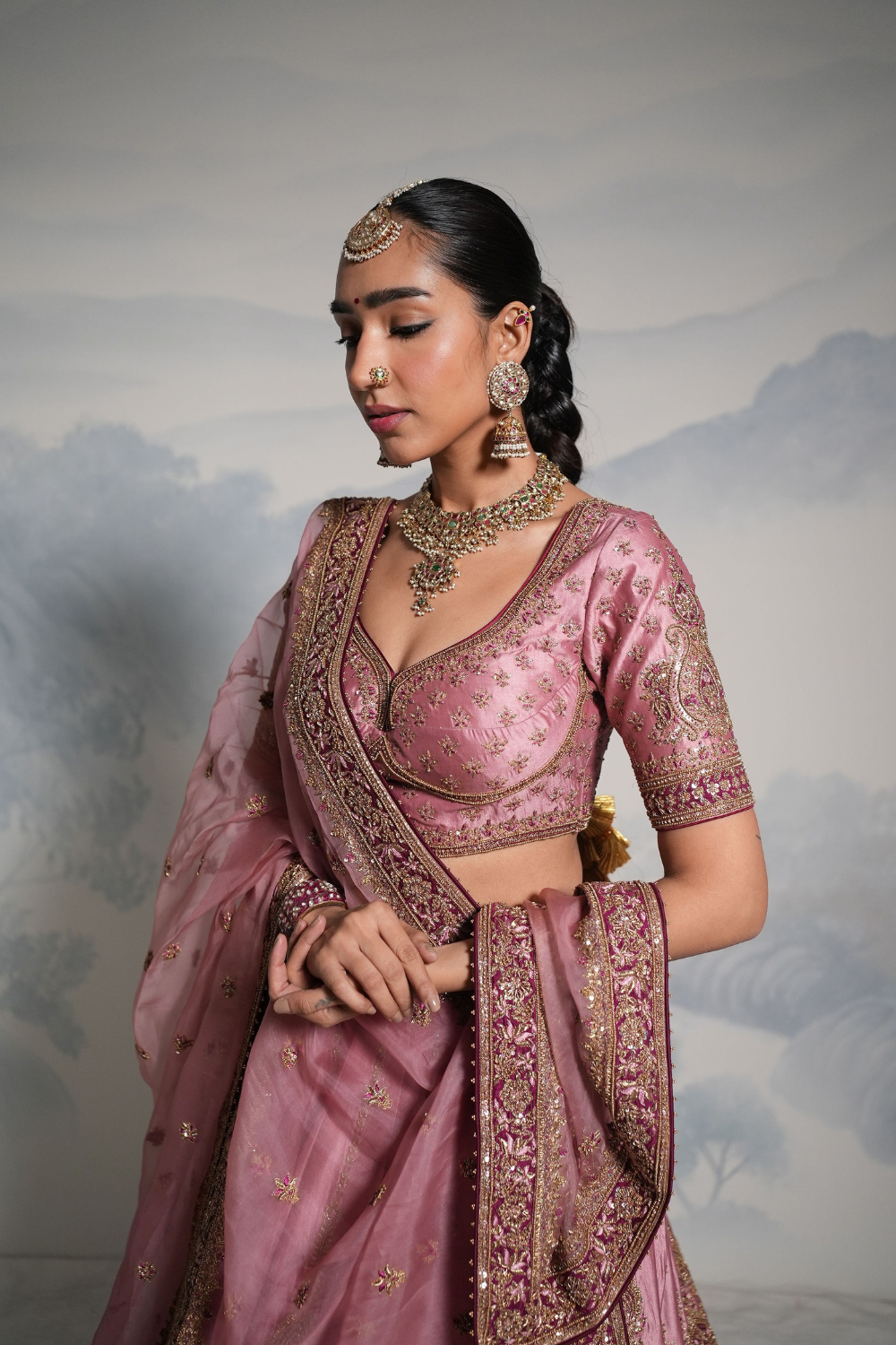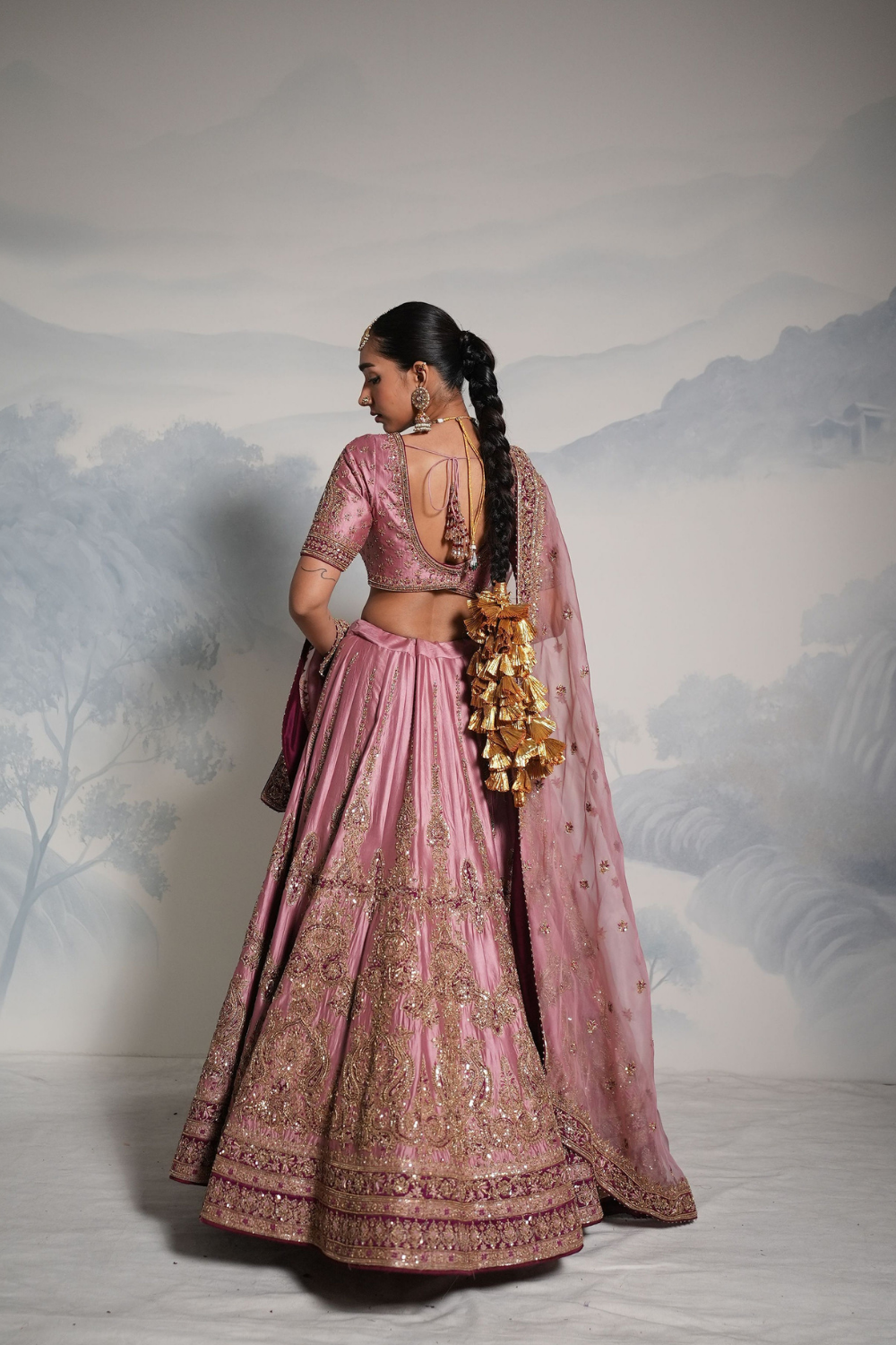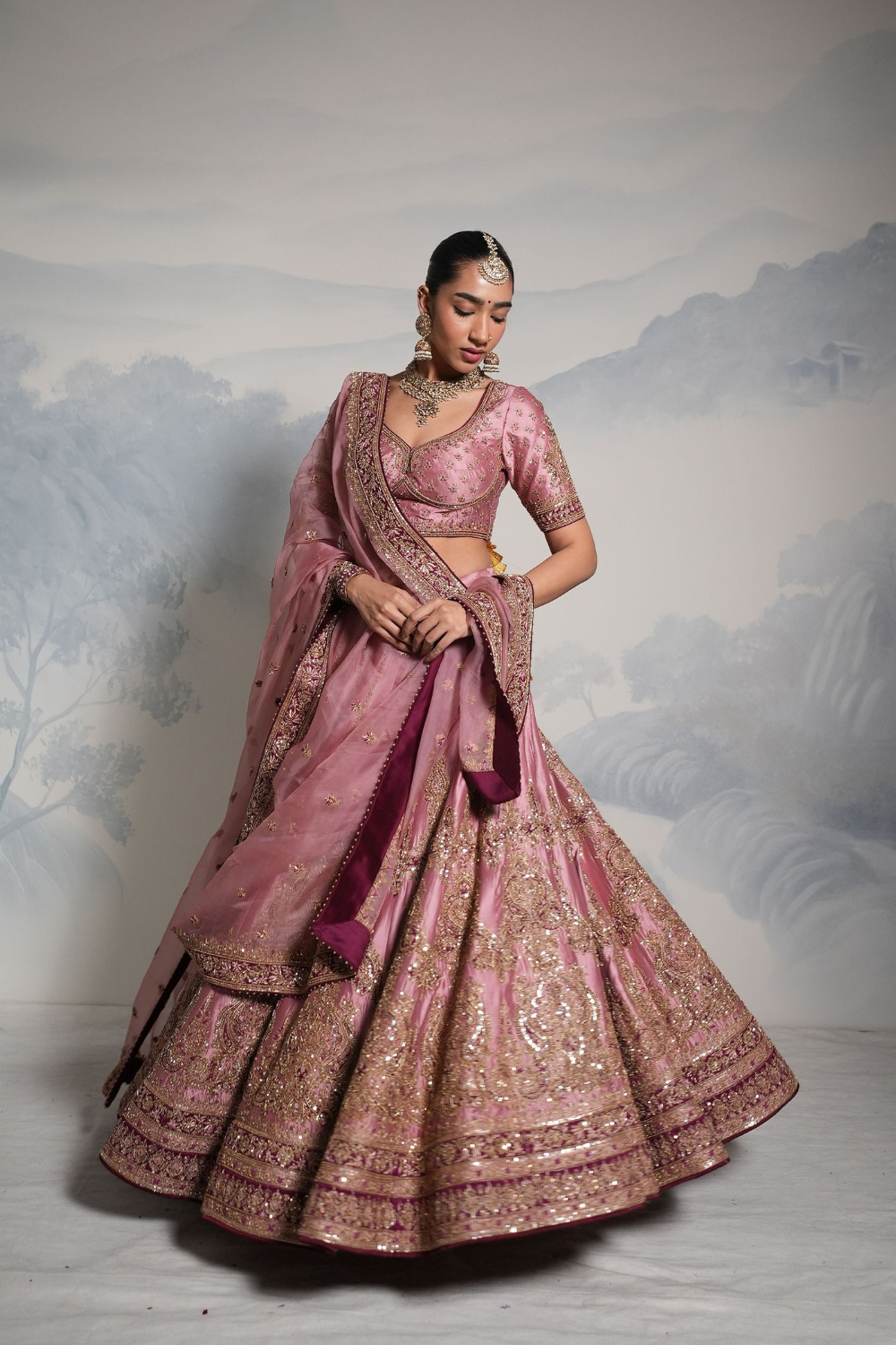 Featuring a lilac wine lehenga set paired with a organza base dupatta with gold dori, zardozi and embellished hand embroidery. Every element of this ensemble showcases meticulous handwork, making it a timeless piece rooted in craft and culture.