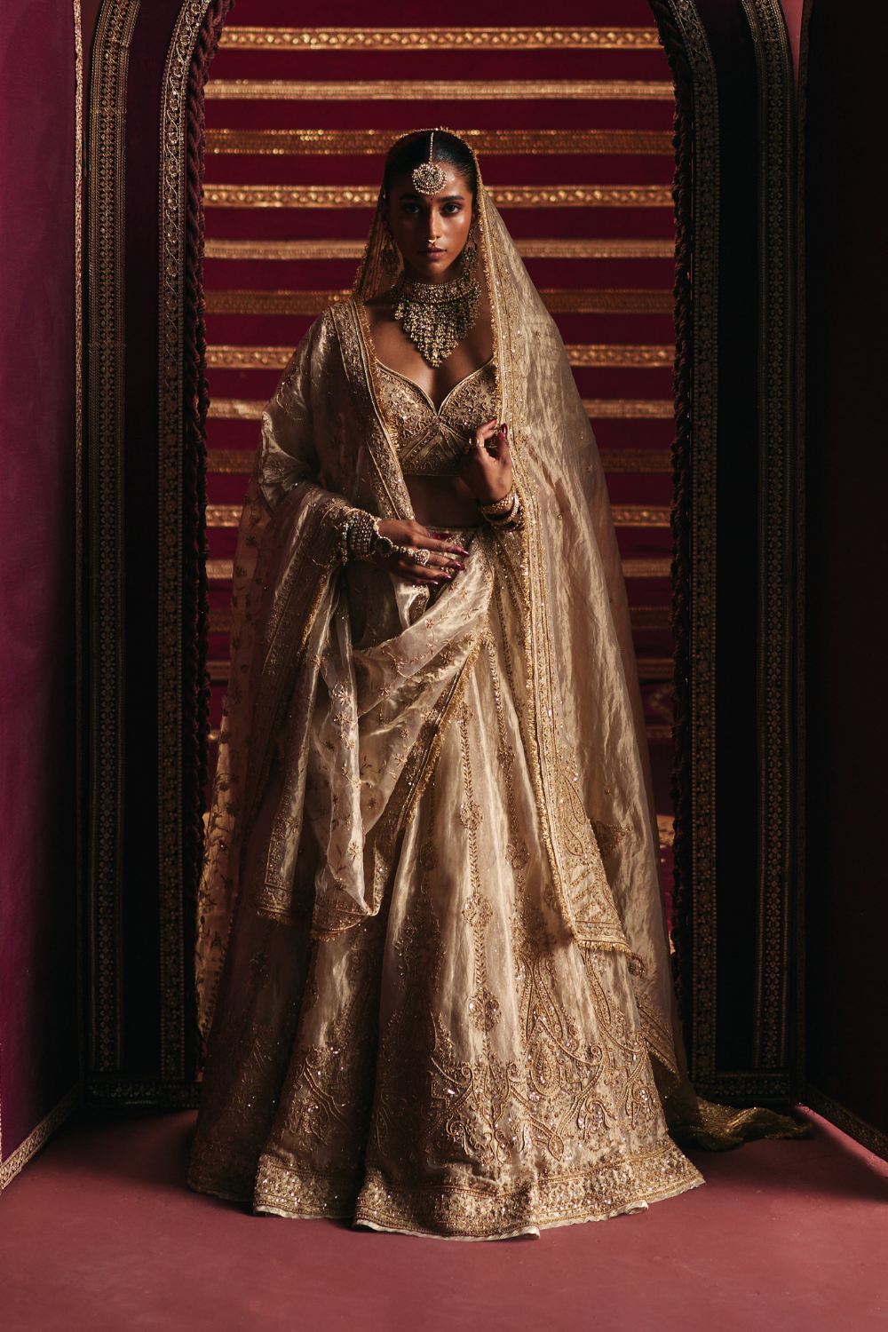Featuring a gold tissue lehenga set paired with a tissue base dupatta with gold dori and embellished hand embroidery.