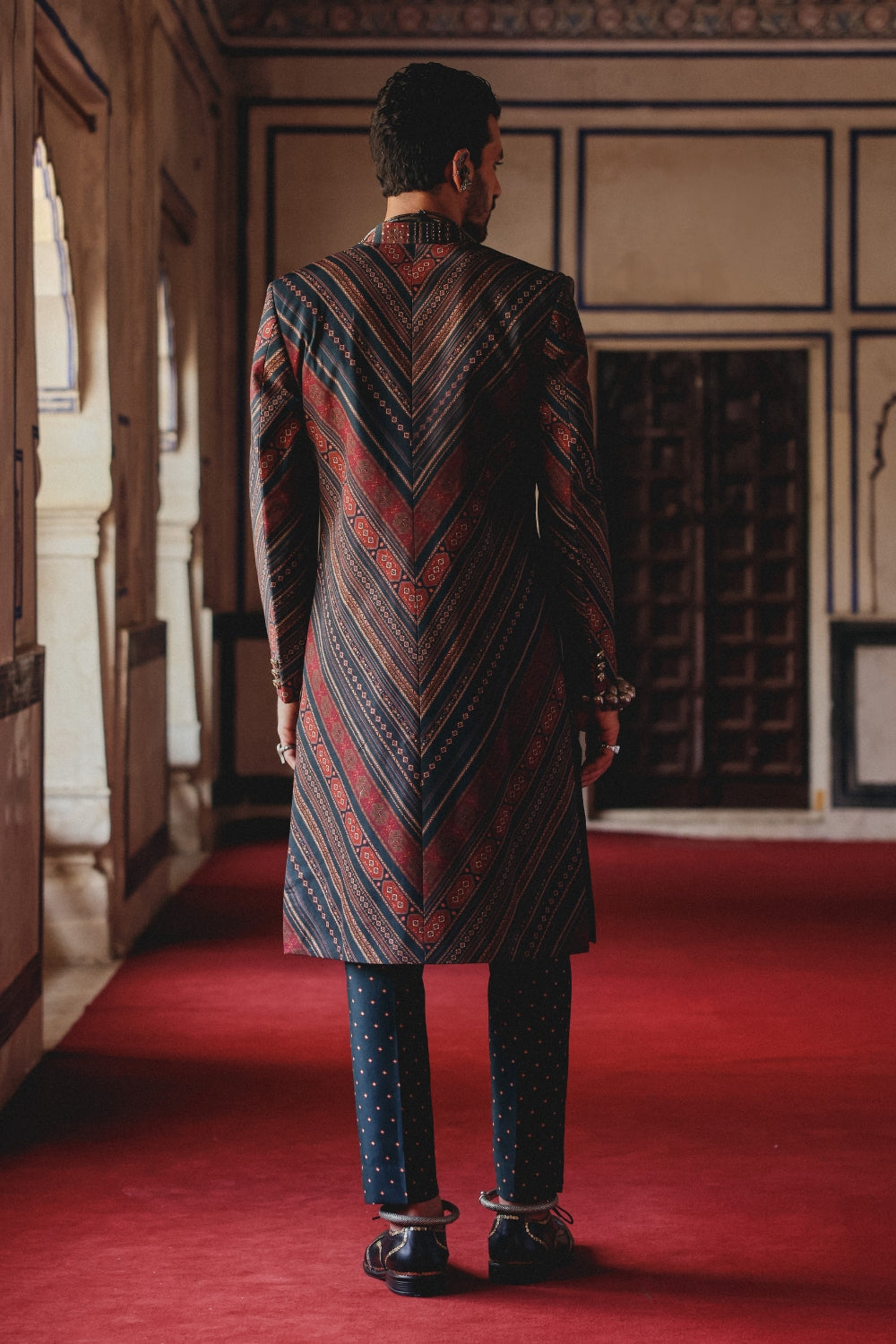 A structured blue jacket set that balances quiet intricacy with clean tailoring. The surface is dotted with delicate motifs, allowing texture to emerge subtly. Rust-hued borders frame the cuffs and hem with geometric rhythm. Finished with a metallic placket and straight trousers, the look carries a sense of restraint - sharp, composed, and culturally rooted without being loud.
